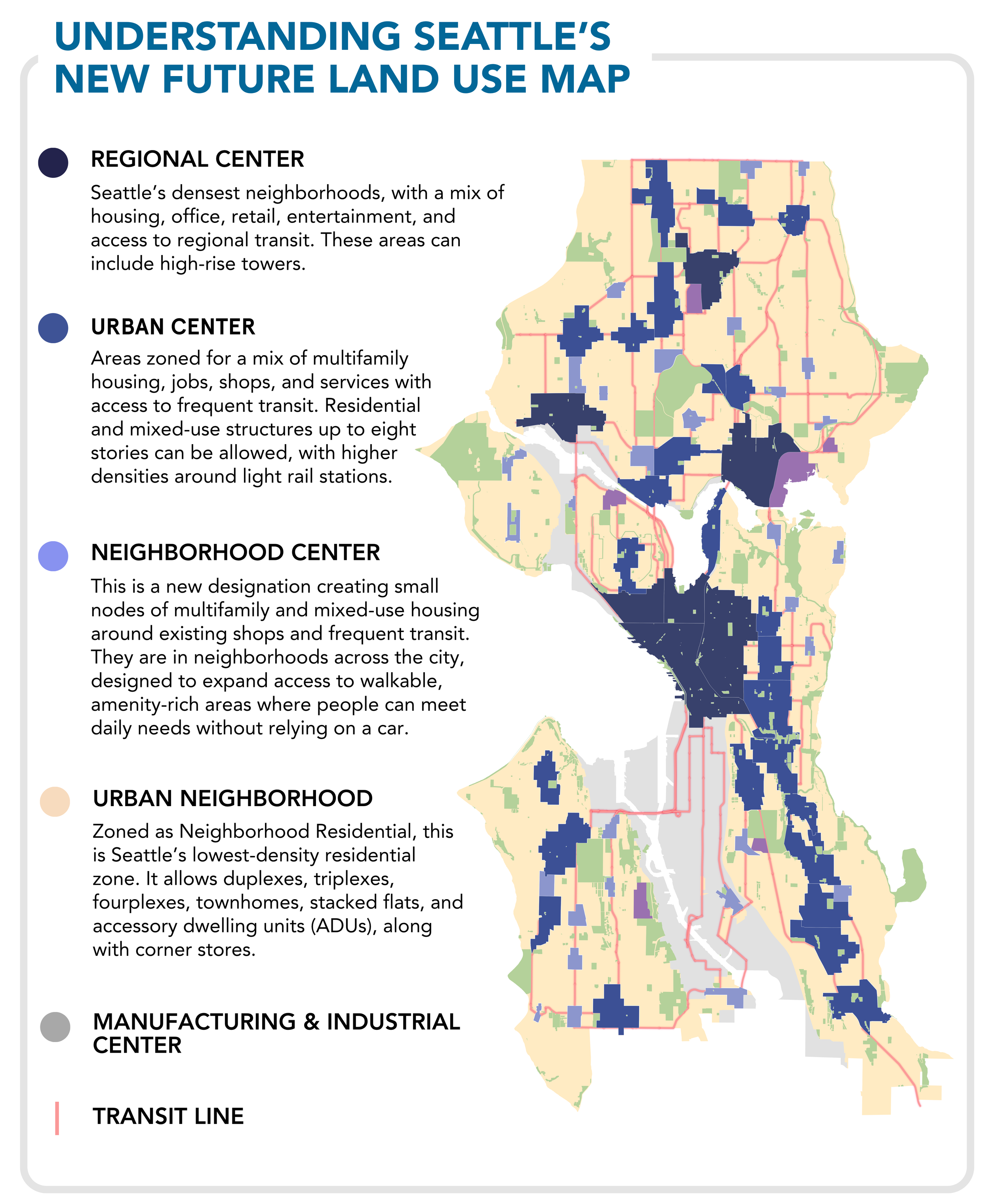 The Comprehensive Plan is the fundamental planning document for the City of Seattle. It dictates where new housing and businesses are allowed, and guides where the city invests in transit, parks, and all the things that make our neighborhoods better. All zoning (rules governing what can be built where) follows from the Comprehensive Plan. By allowing more housing in existing neighborhood residential areas, the city can increase housing supply, promote inclusivity, and support the creation of diverse, complete communities across Seattle.